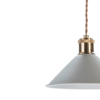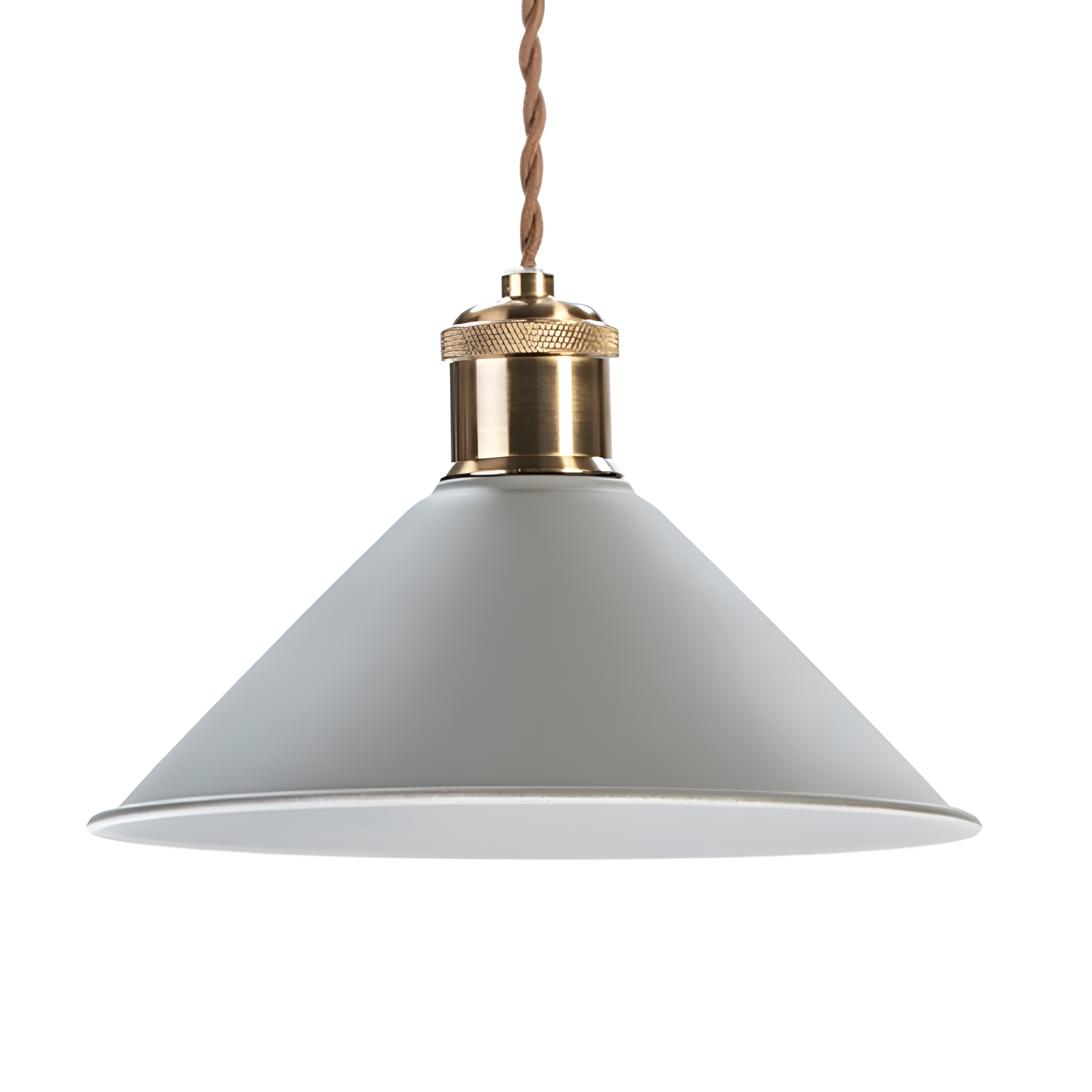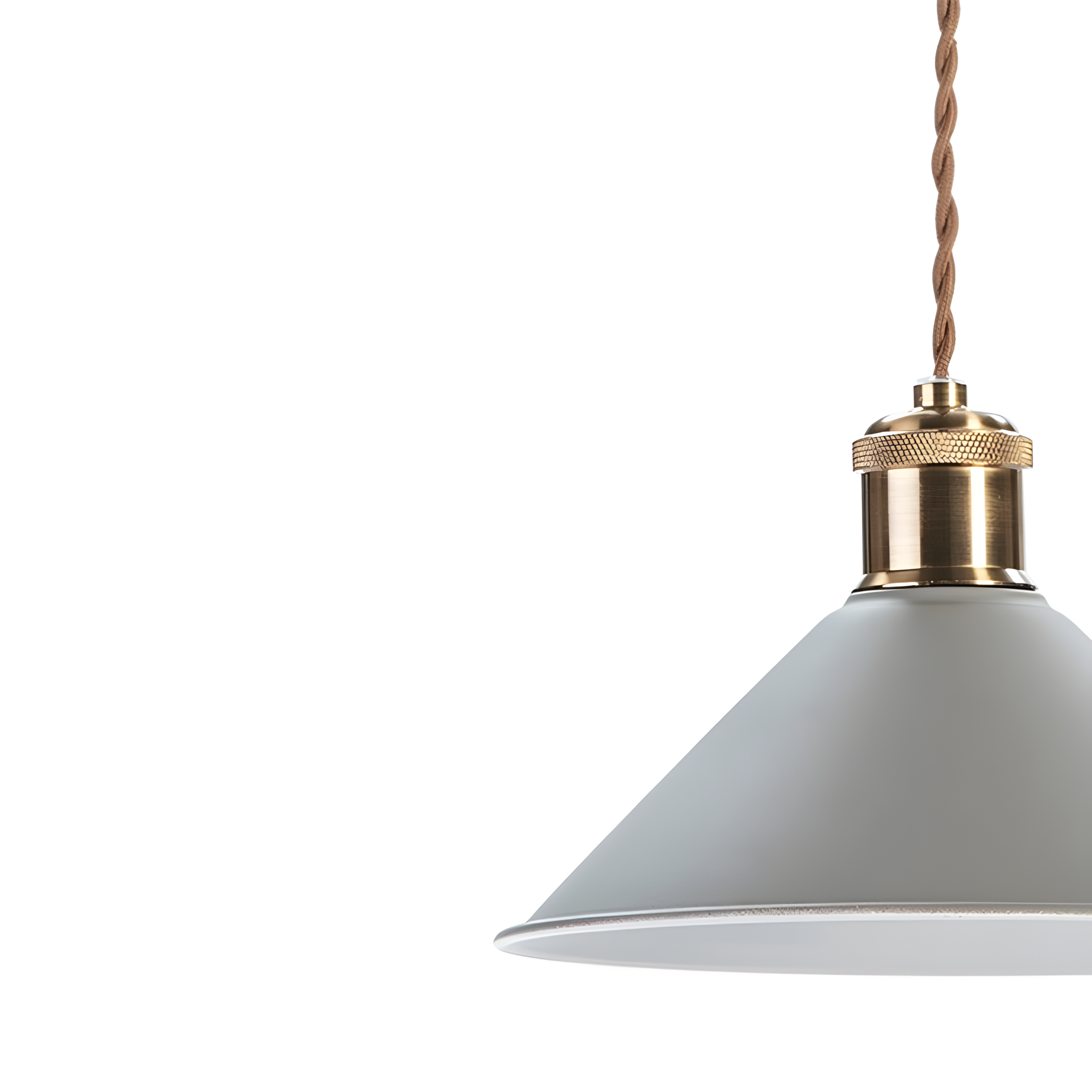 El cable textil marrón aporta un acento cálido y artesanal, mientras que el acabado interior blanco optimiza la reflexión de la luz para un efecto luminoso más amplio y confortable.