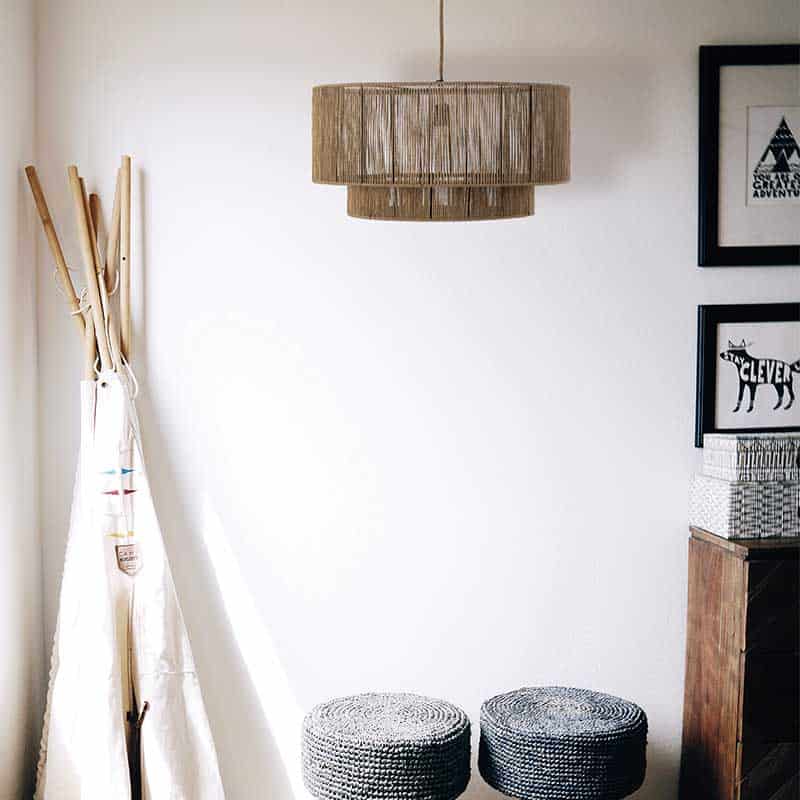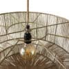 El tono marrón natural del material refuerza su carácter orgánico, mientras que el trenzado manual permite el paso de la luz de forma suave, creando efectos de sombra decorativos que aportan profundidad al ambiente.