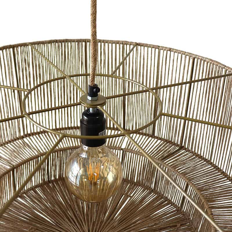 Su cable de cuerda marrón de 1,8 metros mantiene la coherencia estética del diseño, garantizando una presencia visual uniforme y natural. El casquillo E27 permite el uso de bombillas LED, aportando eficiencia y sostenibilidad al conjunto.