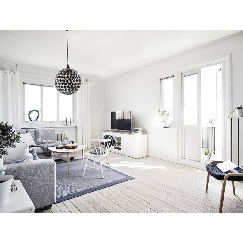 Su cable transparente de PVC permite que la lámpara destaque visualmente sin interrupciones, manteniendo la pureza estética del conjunto. La estructura metálica le proporciona solidez y durabilidad, mientras que el acrílico asegura ligereza y una luminosidad difusa, perfecta para crear ambientes acogedores.