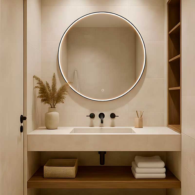 El espejo LED metálico IBÓN destaca por su diseño redondo con borde metálico fino y una iluminación perimetral retroiluminada que aporta una luz suave y envolvente.